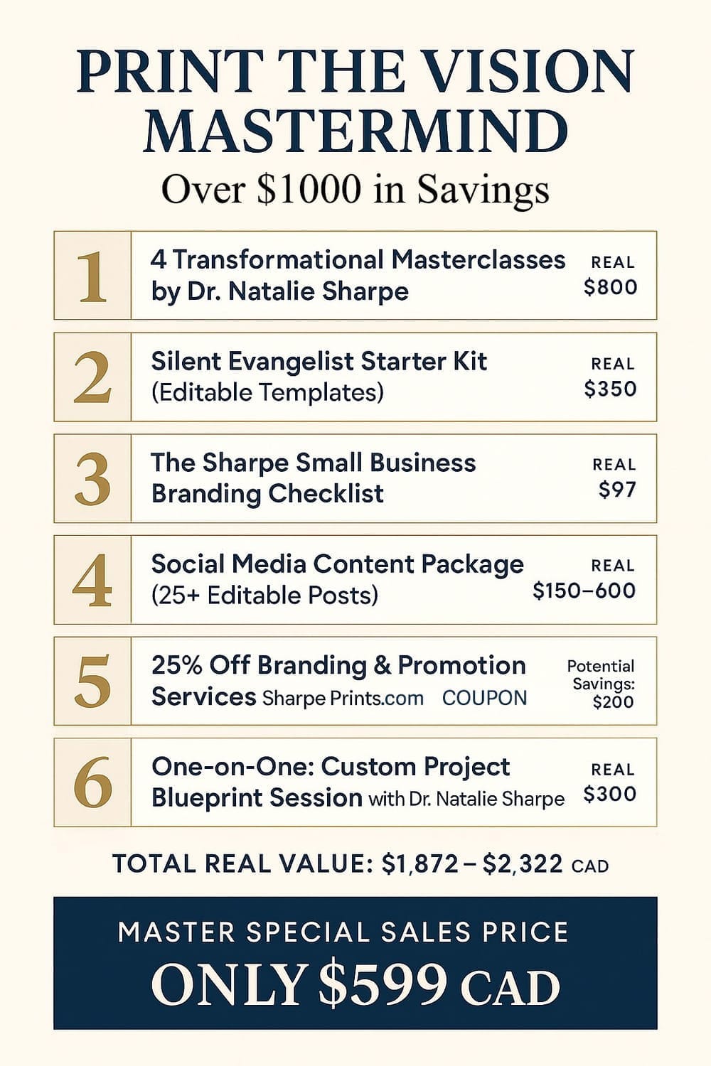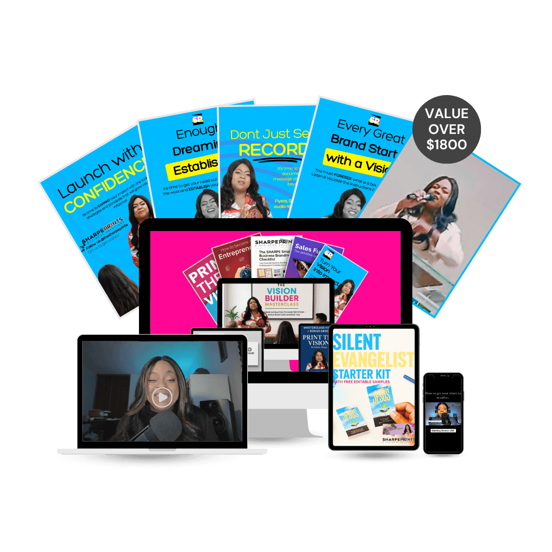This powerful program includes transformational masterclasses, editable marketing and branding tools, social media assets, a Silent Evangelist starter kit, and a one-on-one custom blueprint session with Dr. Natalie Sharpe. With over $1,800 in real value, this mastermind gives you the strategy, systems, and support to build your vision with excellence and supernatural momentum.